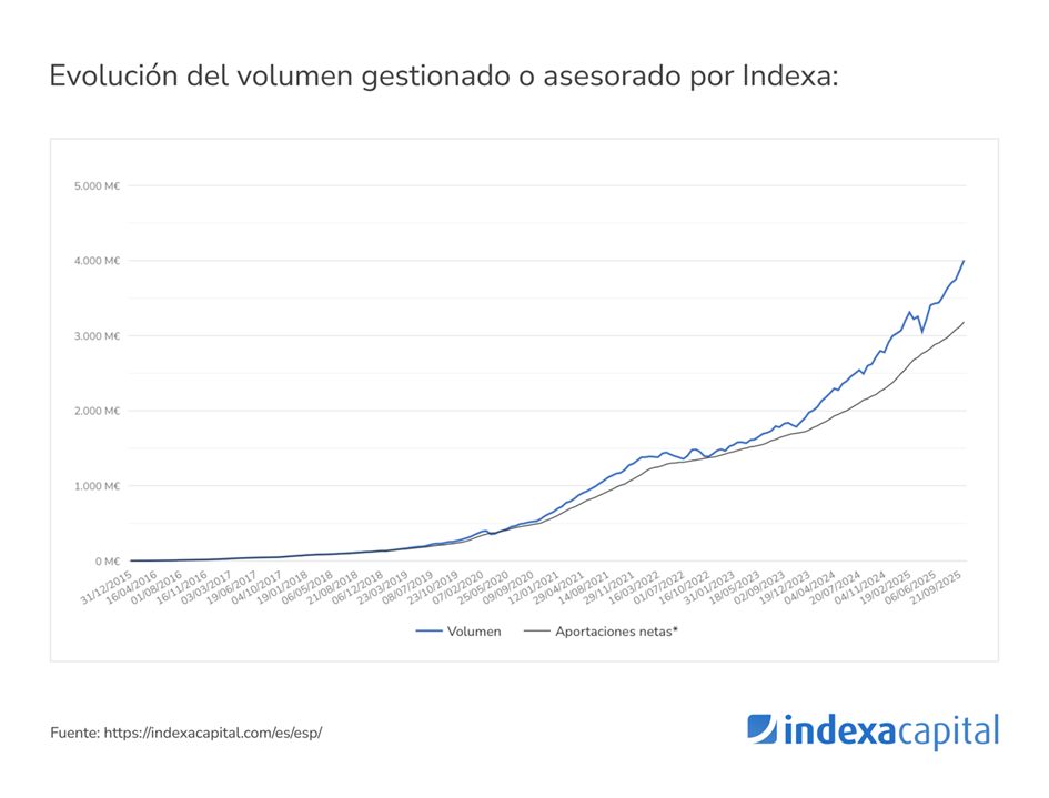 El equipo de Indexa Capital ha recordado cómo ha evolucionado el volumen gestionado en los últimos años. "En junio de 2021 alcanzó su primer millardo (mil millones) de euros gestionados; en diciembre de 2023 comunicó el segundo y en diciembre de 2024 el tercero; y ahora, en octubre de 2025, anuncia el cuarto", han destacoado desde la firma.