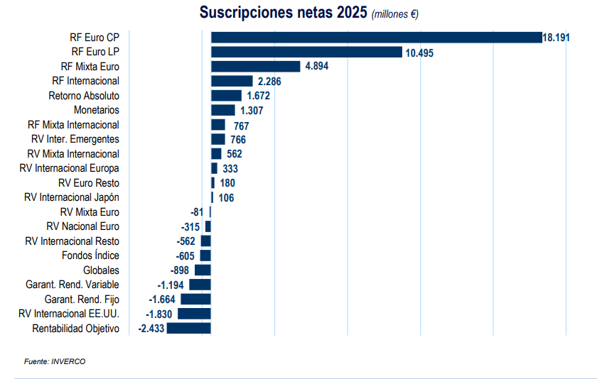 "En los fondos rentabilidad objetivo ha habido aportaciones netas negativas, ha habido reembolsos. Parte de ellos se ha canalizado a inversiones de renta fija. En su mayoría ha ido dirigido a esto, pero en la última parte de año ya veíamos que categorías como mixta o renta fija ya tenía aportaciones casi de 4.000 millones, incluso los globales también con aportaciones positivas de 1.000 millones. Parte están siendo dirigidos a renta fija, pero yo diría que en los últimos meses claramente combinando con algo más de riesgo", ha añadido.