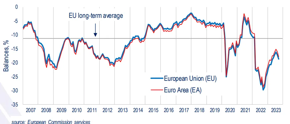 La confianza del consumidor en la eurozona se ha situado muy por debajo de lo esperado por los analistas, ya que se vaticinaba una caída, pero de menores dimensiones. En concreto, el consenso estimaba que se situara en el -16,5.