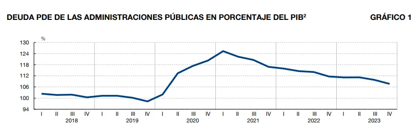 La deuda de las administraciones públicas en España se situó en 1,574 billones de euros a finales de 2023, según ha confirmado este miércoles el Banco de España. Esta cifra supone el 107,7% del producto interior bruto (PIB) en el cuatro trimestre de 2023, unos cuatro puntos porcentuales menos respecto a la cifra registrada a finales de 2022, cuando la ratio se situó en el 111,6% del PIB.