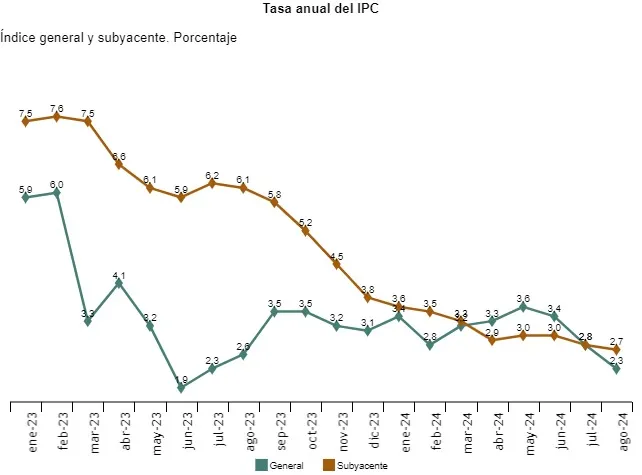 Por su parte, la inflación subyacente —que no tiene en cuenta los precios de la energía y de los alimentos frescos al considerarlos más volátiles— se moderó hasta el 2,7% en agosto, según el INE. Es decir, una décima por dejado de la cifra registrada en julio.