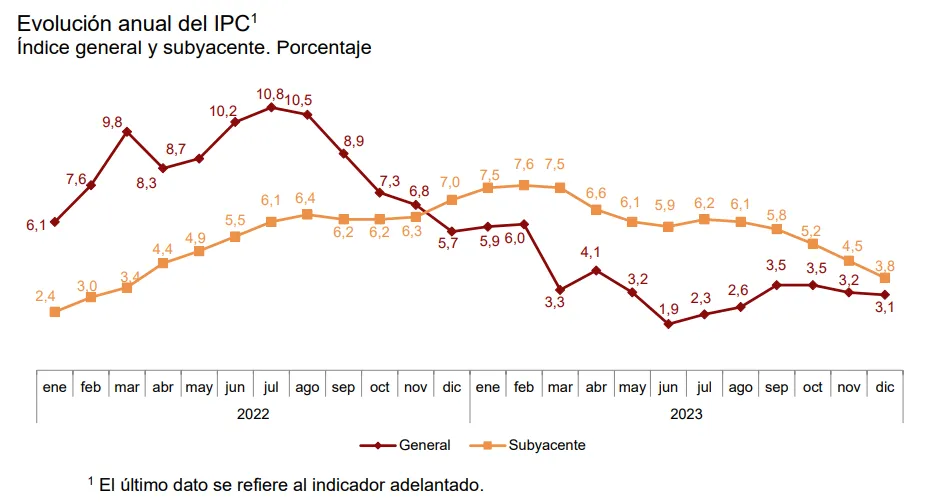 Por su parte, la inflación subyacente —que no tiene en cuenta los precios de la energía y de los alimentos frescos al considerarlos más volátiles— se ha reducido notablemente hasta el 3,8% en diciembre, según el dato anticipado por el INE. Es decir, siete décimas por debajo del 4,5% registrado en noviembre.