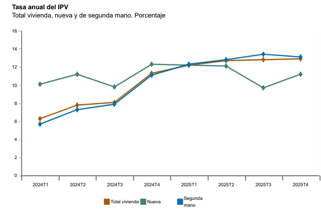 En el cuarto trimestre de 2025, el precio de la vivienda libre aumentó un 12,9% respecto al mismo periodo del año anterior, una décima más que en el trimestre previo. Se trata de la tasa más elevada desde el primer trimestre de 2007. Con este dato, el precio de la vivienda acumula ya 46 trimestres consecutivos de subidas interanuales.
