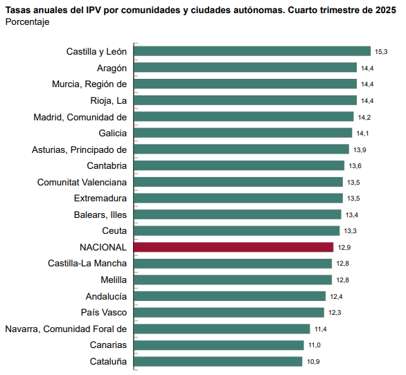 El precio de la vivienda libre en España aumentó una media del 12,7% en 2025, según el Índice de Precios de Vivienda (IPV) publicado este viernes por el Instituto Nacional de Estadística (INE). , Este aumento supone su mayor incremento desde 2007, en plena burbuja inmobiliaria.