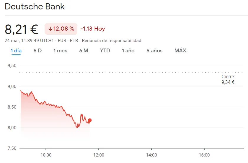 Las acciones de Deutsche Bank han empezado este viernes la jornada bursátil con una caída del 3% después de que el jueves se produjera un importante aumento del coste de los seguros contra el riesgo de impago (CDS). Sin embargo, la situación ha empeorado rápidamente tras la apertura.