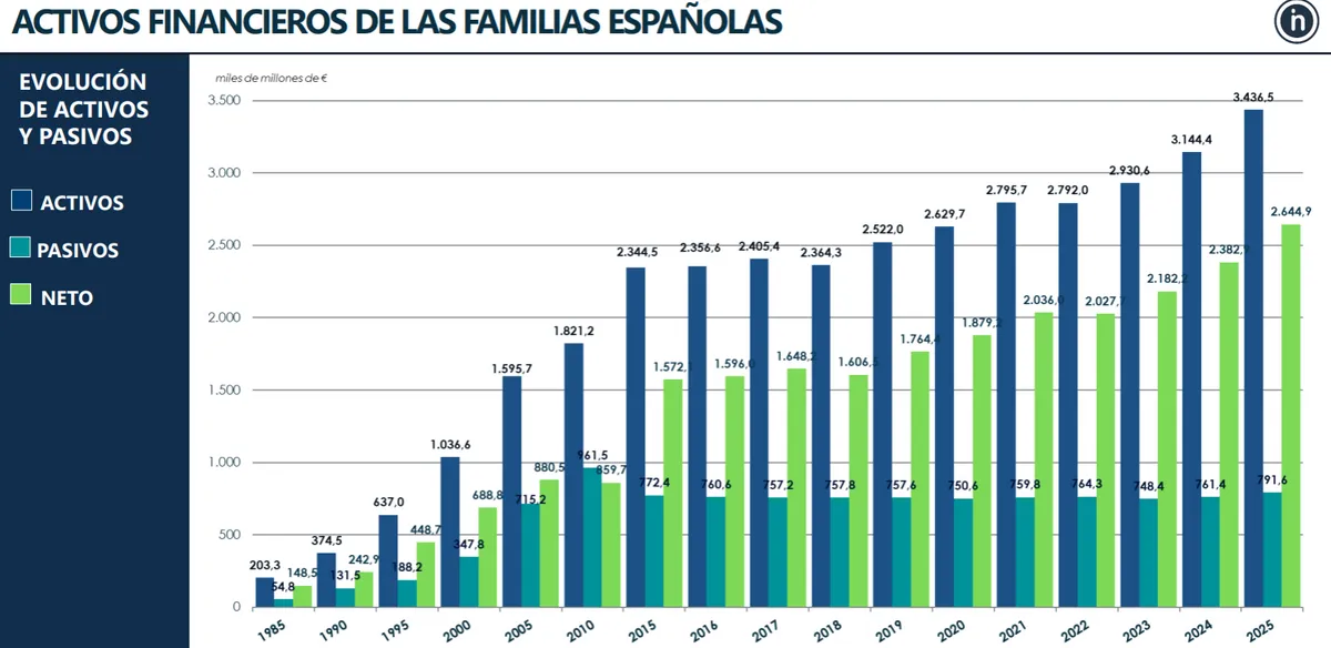 El ahorro financiero total de las familias españolas se situó en 3,44 billones de euros a finales de diciembre de 2025. Se situó así en un nuevo máximo histórico. En el conjunto del año, los hogares aumentaron su saldo en activos financieros en 292.136 millones de euros (9,3%). Fue la mayor subida anual de toda la serie histórica.