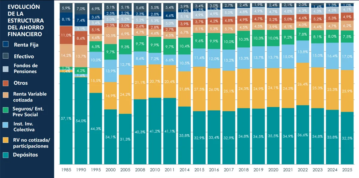 Gracias a estas fuertes entradas a fondos, la ponderación de las instituciones de inversión colectiva alcanzó un nuevo máximo histórico del 17% del total del ahorro financiero de las familias españolas. Esto supone un crecimiento de 0,6 puntos porcentuales respecto a 2024 (16,4%).