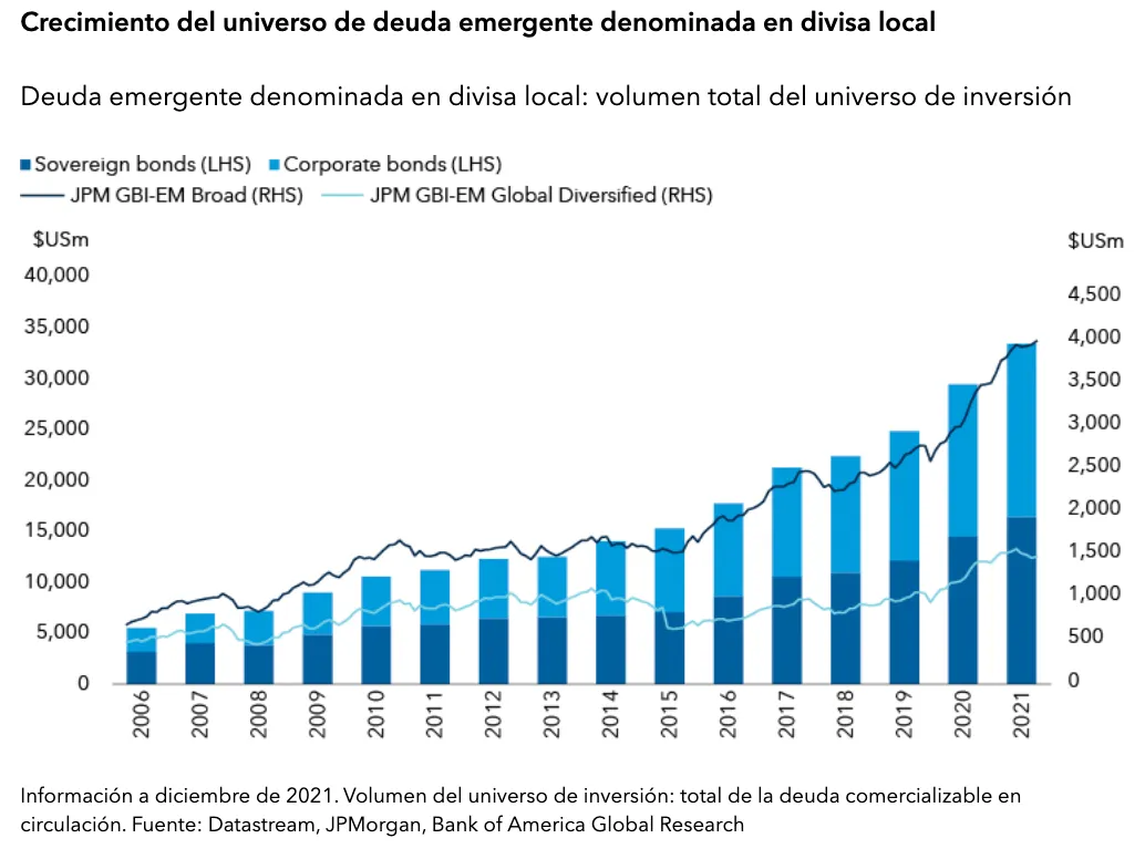 Este gráfico difundido por Capital Group muestra el crecimiento de la deuda emergente denominada en divisa local como clase de activo: