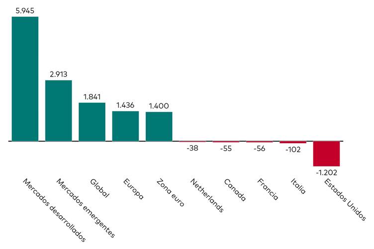 Por su parte, los ETF de renta fija mostraron una clara preferencia por la eurozona, que recibió 3.400 millones de USD. Esta categoría ha mantenido entradas netas cada mes del año, alcanzando 43.600 millones de USD acumulados.
