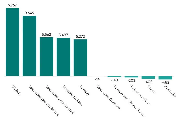 Por exposición geográfica, los inversores han mostrado una clara preferencia por los ETFs de renta variable global, que sumaron 9.800 millones de dólares, seguidos de cerca por los de mercados desarrollados, con 8.600 millones. También han tenido un comportamiento destacado los ETFs de renta variable estadounidense, europea y de mercados emergentes. En el lado negativo, los ETFs de renta variable australiana y china han experimentado salidas modestas de 482 y 405 millones de dólares, respectivamente.