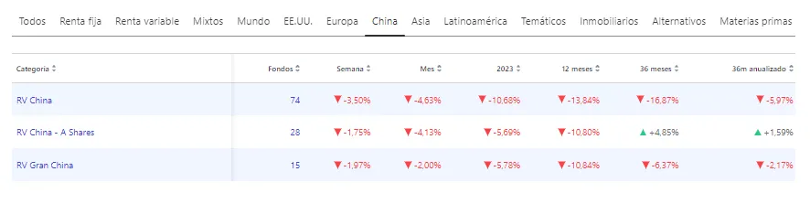 Los fondos de inversión de renta variable china (RV China) llevan una pérdida superior al 10% en lo que va de año. Esta categoría incluye 74 fondos de inversión, donde solo uno, el Principal Global Investors Funds - China Opportunities Equity Fund, logra una rentabilidad positiva en 2023, aunque muy exigua (+0,65%).