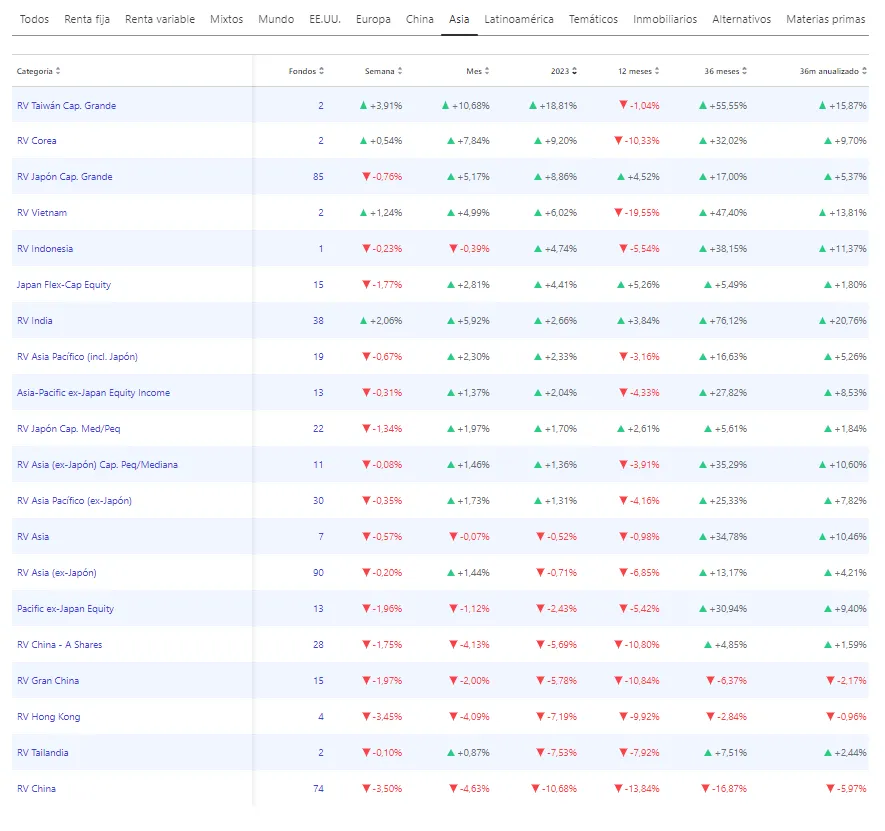 Este buen comportamiento se está trasladando a los fondos de inversión en Asia, que están logrando buenos rendimientos en 2023. Así se puede comprobar en la sección de categorías de fondos de inversión en Finect.