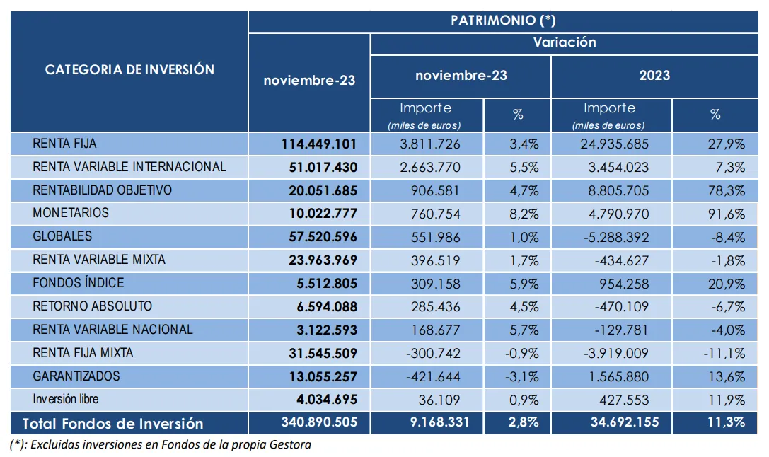 Gracias a este incremento, el patrimonio total de los fondos en España se ha colocado en los 340.891 millones de euros en noviembre. Se trata de un nuevo máximo histórico. Esta cifra supone un incremento del 2,8% respecto al mes anterior.