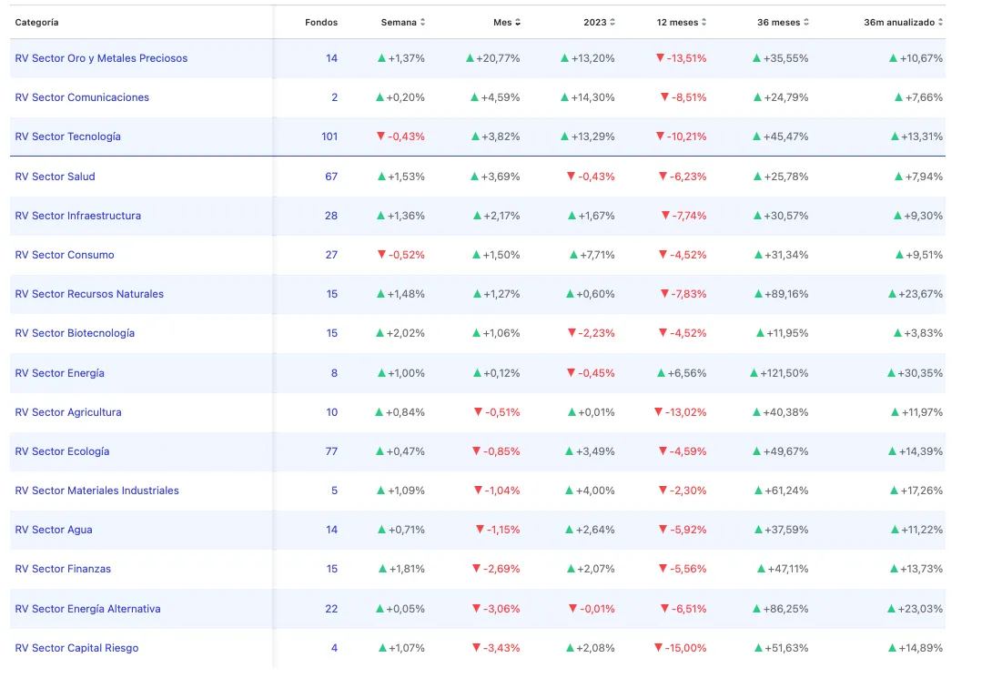 La categoría de fondos de inversión en renta variable del sector oro y materiales preciosos acumula una ganancia media superior al 20% en el último mes. Según los datos de Morningstar que pueden verse en la sección de categorías en Finect, esta categoría destaca muy por encima de otras temáticas.