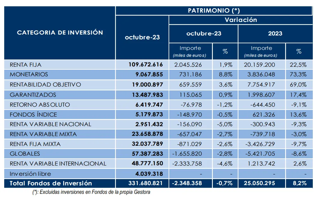 Tras esta pérdida, el patrimonio total de los fondos en España se ha situado en 331.681 millones de euros en octubre. Esta cifra ha supuesto un descenso del 0,7% respecto al volumen registrado en el mes de septiembre. La patronal ha destacado, en un intento de ver el parte positiva, que el volumen se ha incrementado en unos 25.000 millones de euros a lo largo del año 2023.