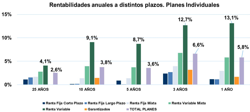 Los planes de renta variable fueron los que mejores retornos registraron en todos los plazos analizados. En el último año alcanzaron una revalorización del 13,1%, mientras que a tres años la rentabilidad media anual neta se situó en el 12,7% y a cinco años en el 8,7%.