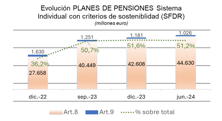 Esta cifra supone que el 51,2% del patrimonio total de los planes de pensiones está invertido en productos financieros sostenibles. Es decir, los planes de pensiones sostenibles acaparan más de la mitad del patrimonio invertido en estos productos para la jubilación. Eso sí, se ha producido un retroceso de cuatro décimas respecto al 51,6% del patrimonio total que representaba a finales de 2023.