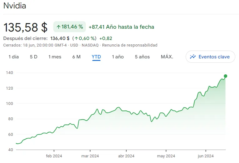 El rally de Nvidia en Bolsa no se ha parado durante la primera mitad 2024, gracias al impulso de la inteligencia artificial. Las acciones han subido aproximadamente cerca de un 180% en lo que va de año.