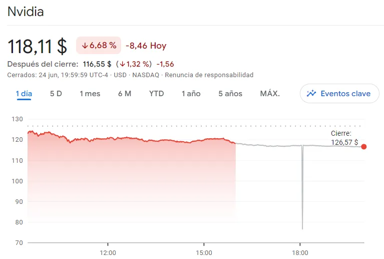 Nvidia continúa sufriendo en Bolsa. Las acciones del fabricante de microchips cayeron un 6,68% en la sesión bursátil de este lunes hasta situarse en los 118 dólares, según Google Finance. Esta caída se suma a los retrocesos sufridos durante el jueves y viernes de la semana pasada, del 3,5% y el 3,2% respectivamente. En total, los títulos de la compañía han sufrido unas pérdidas de más del 13%.