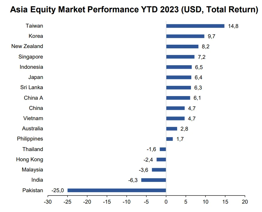 Al igual que ha ocurrido en Estados Unidos, donde las empresas tecnológicas son las que están tirando de la Bolsa, los mercados de Asia más tecnológicos son los que mejor se están comportando en 2023. "Excepto Pakistán, ha sido un año decente para los mercados en Asia. Taiwán y Corea son los mercados que mejor lo han hecho, porque son mercados muy tecnológicos", explica Sarah Lien (Allianz GI).
