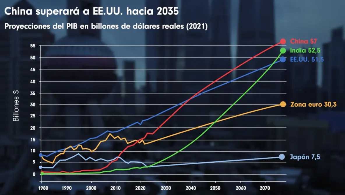 "Según las proyecciones del FMI, China era en 2022 la segunda economía del mundo con un porcentaje del 18% del PIB nominal global frente al 25% de Estados Unidos, primera economía mundial. Goldman Sachs pronostica que alcanzará la primera posición hacia 2035", explica Óscar Esteban, director de ventas en Fidelity International, en un vídeo difundido en Finect.