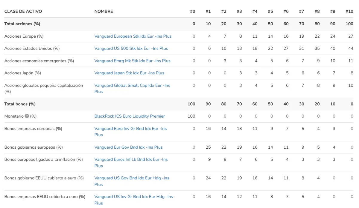 El peso de este vehículo de inversión de Vanguard en la cartera de Indexa disminuye progresivamente desde el 25% en la cartera #1 al 0% en la cartera #10.