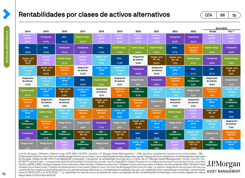 Si se echa la vista atrás, JPMorgan AM ha analizado también qué rentabilidades han logrado las diferentes clases de activos alternativos en los últimos años, desde 2014 hasta 2023.