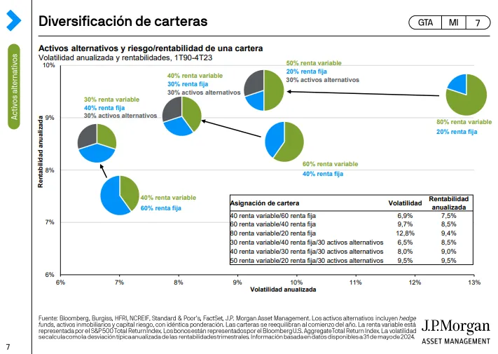 La gestora de activos de origen estadounidense JPMorgan Asset Management ha comparado cómo se habrían comportado diferentes carteras de inversiones desde el primer trimestre de 1990 hasta el cuarto trimestre de 2023 en la última edición de su Guía de Alternativos. Algunas carteras no tienen ningún peso en activos alternativos, mientras que en otras tienen un peso del 30%.