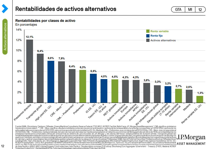 Según este análisis de JPMorgan AM, los activos alternativos que ofrecen una mayor rentabilidad son los préstamos directos, con una revalorización del 12,1%. Le siguen las inversiones en transporte global, con una rentabilidad del 9,4%.