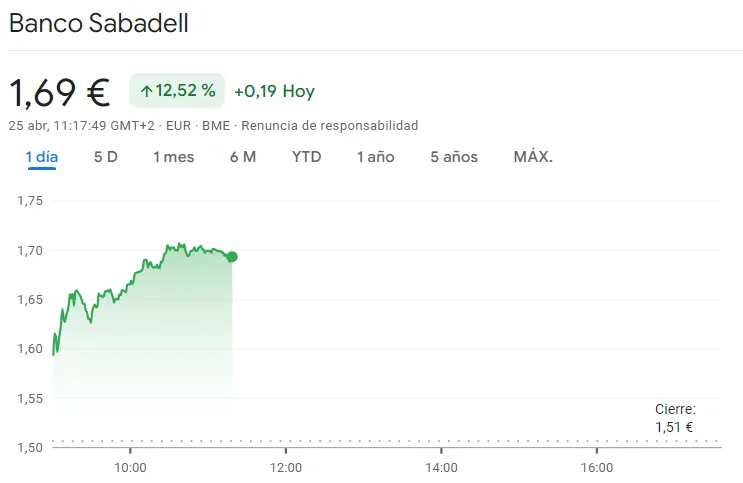 Banco Sabadell se ha disparado en Bolsa tras aumentar sus beneficios. La entidad financiera capitaneada por César González-Bueno ha registrado un beneficio neto de 308,1 millones de euros en el primer trimestre de 2024, según ha comunicado el banco a la Comisión Nacional del Mercado de Valores (CNMV).