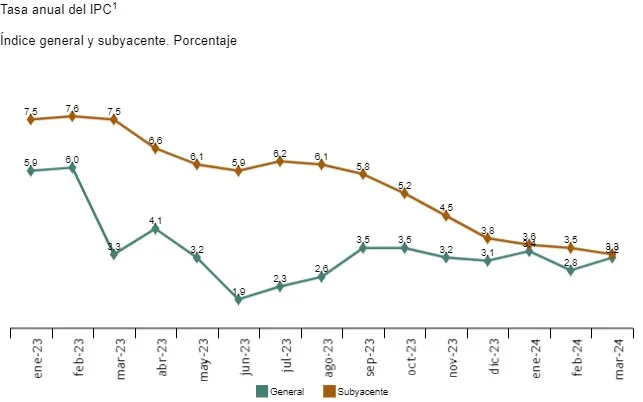 Por su parte, la inflación subyacente —que no tiene en cuenta los precios de la energía y de los alimentos frescos al considerarlos más volátiles— se redujo hasta el 3,3% en marzo, según el INE. Es decir, dos décimas por debajo del 3,5% registrado en febrero.