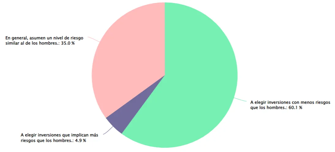 La mayoría de los asesores asegura que las mujeres asumen menos riesgo a la hora de invertir. "El 60% de los asesores financieros considera que las mujeres asumen un menor riesgo que los hombres de cara a sus inversiones, frente a un pequeño 5% que cree que son ellas las que eligen inversiones que implican un mayor riesgo", señala la encuesta.