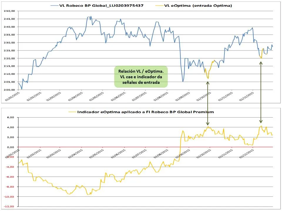 Para ayudarme a decidir sobre el cuándo uso criterios técnicos, es para lo que he desarrollado el indicador eOptima (entrada óptima), y cuyo objetivo es determinar buenas entradas en los fondos posicionados en renta variable que conforman mi cartera seleccionada.
