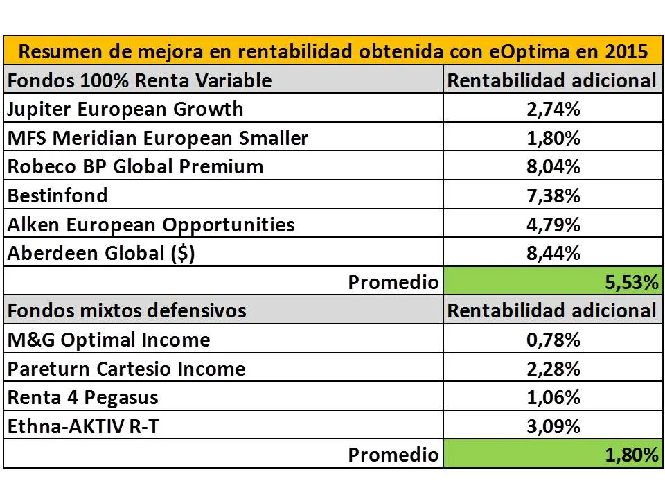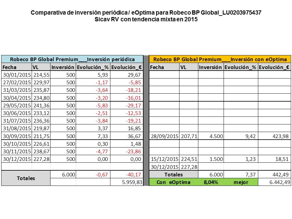 Tanto en los gráficos como en los reportes comparativos sobre inversión periódica e inversión con eOptima se pueden evaluar los resultados obtenidos en 2015, los resultados obtenidos me parecen buenos con mejoras medias en torno al 5,5% en los fondos todo RV.
