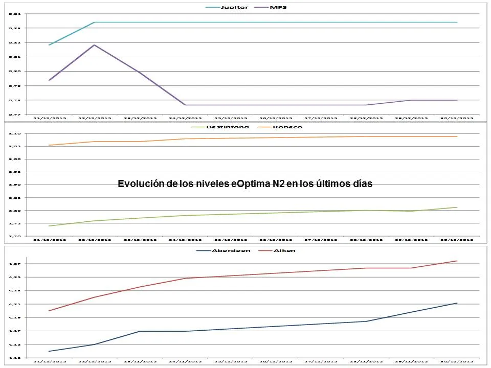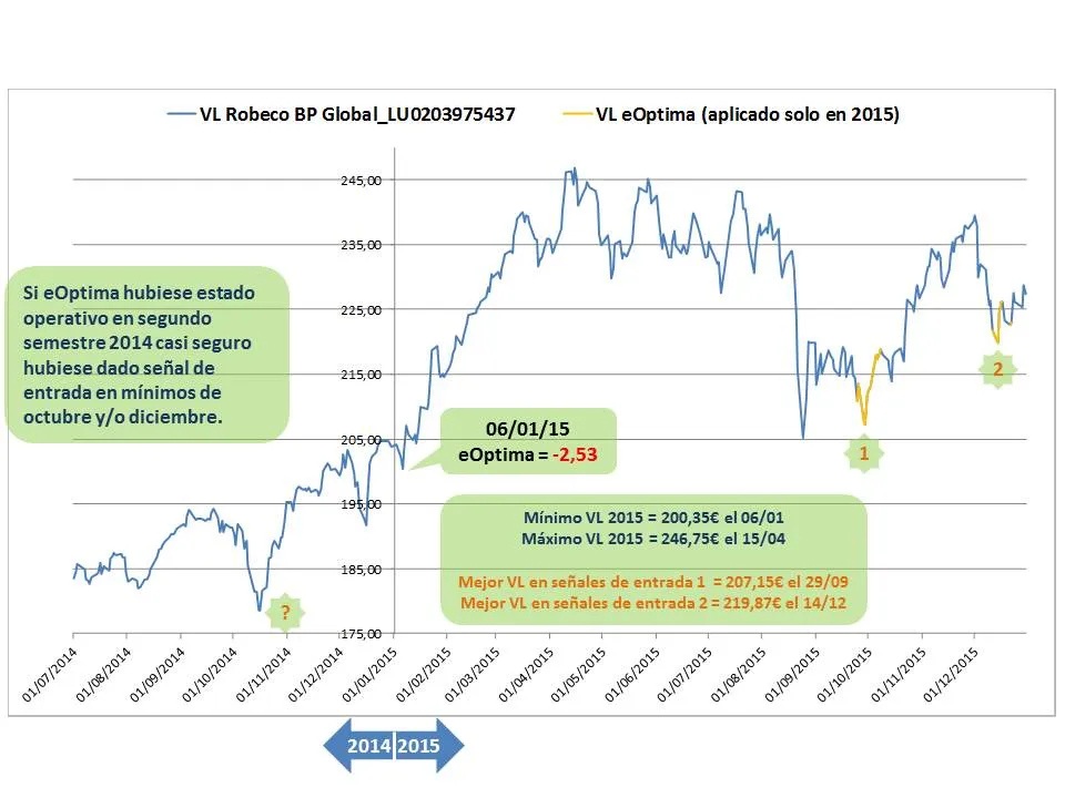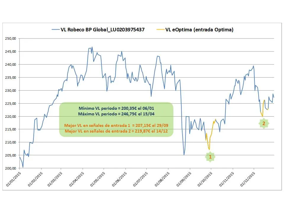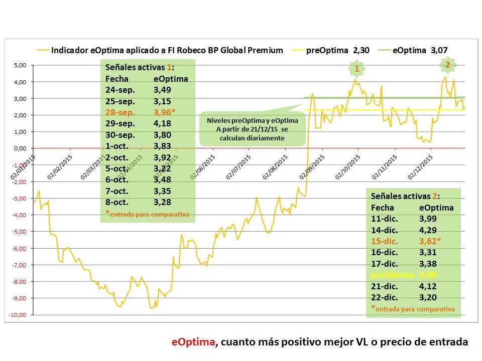 Para homogenizar las entradas realizadas con eOptima en todos los fondos analizados, se ha tomado la tercera señal en todos los casos independientemente de que sea o no la mejor entrada. En la operativa real no existe restricción al respecto, pudiéndose operar a partir de que el indicador toque el nivel eOptima o incluso antes cuando alcanza el nivel preOptima.