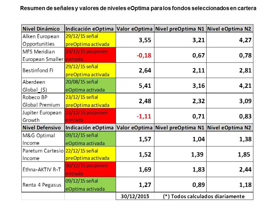 El siguiente resumen recopila todos los fondos, señales y niveles con sus valores actuales que iré publicando con periodicidad al menos semanal para facilitar seguimiento. También los valores eOptima los integrare en artículo donde trato estrategia de cartera con protege plus y tendencia mercados RV.