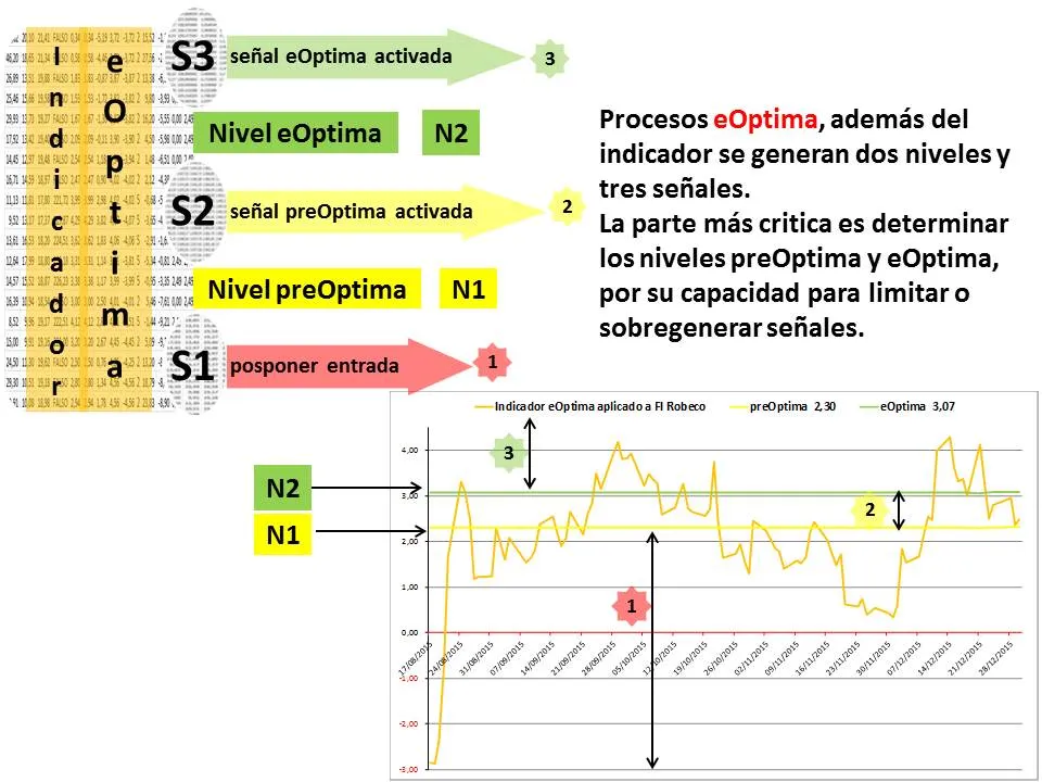 Los procesos eOptima, además del propio indicador generan dos niveles y las siguientes tres señales: