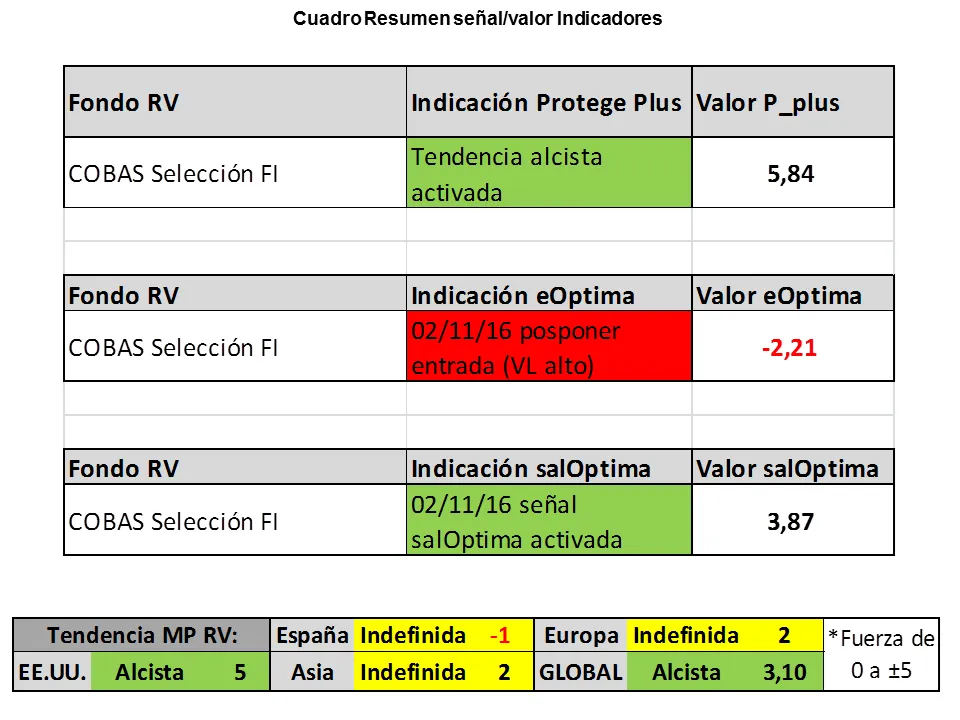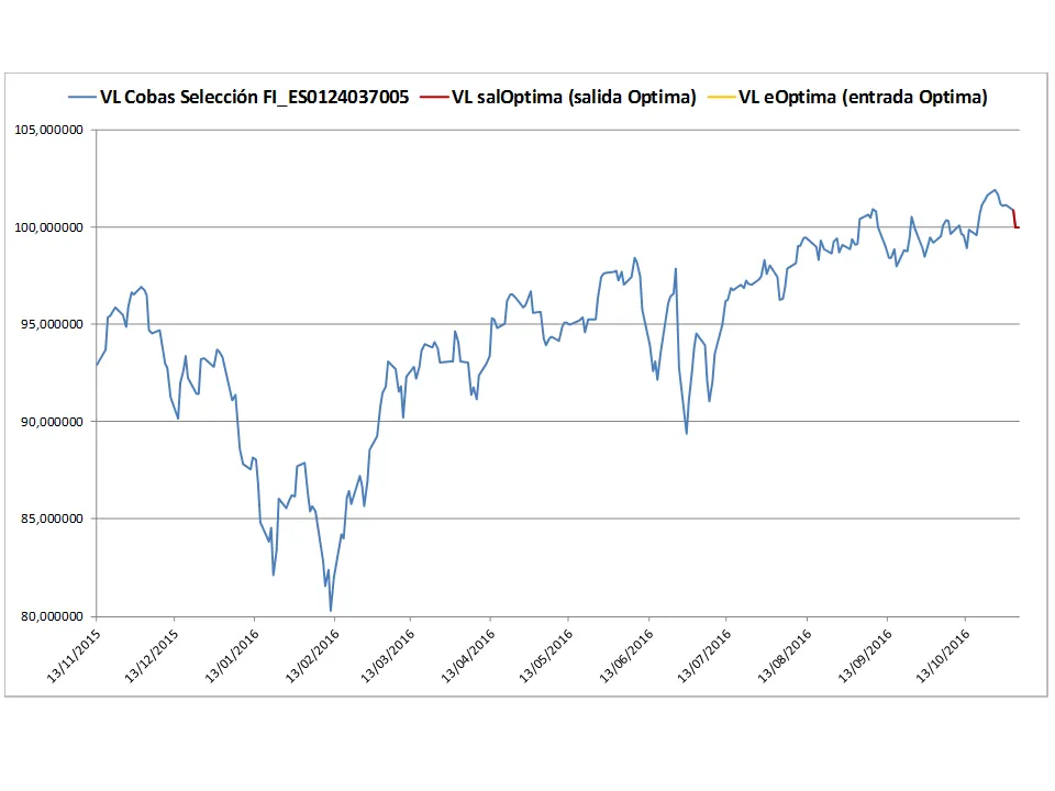 Personalmente estoy decidido en invertir en COBAS Selección FI, pero teniendo en cuenta los resultados obtenidos pospongo la entrada hasta otro momento más propicio. No quiero decir que exclusivamente el momento más propicio sea el de entrar a un VL más barato que los 100€ actuales, sino más bien el de encontrar un momento con mejores perspectivas de revalorización de la inversión que el momento actual. Recordar que mis indicadores además de utilizar el VL (de momento ficticio) utilizan otras variables reales como la tendencia en los mercados.