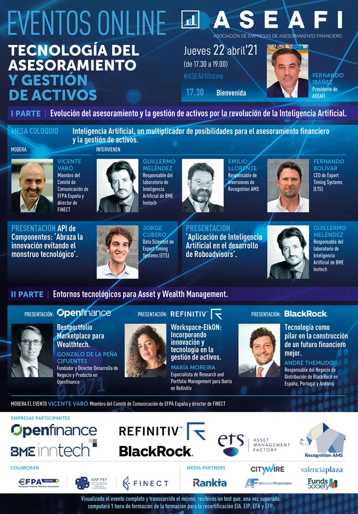 Este evento, promovido por ASEAFI, cuenta con Refinitiv, BME Inntech, BlackRock, Recognition AMS, Expert Timing Systems (ETS) y se desarrollará con la colaboración de EFPA España, IEAF, Finect y con El Asesor Financiero, Citywire, Funds Society, Valencia Plaza y Rankia como media partners.