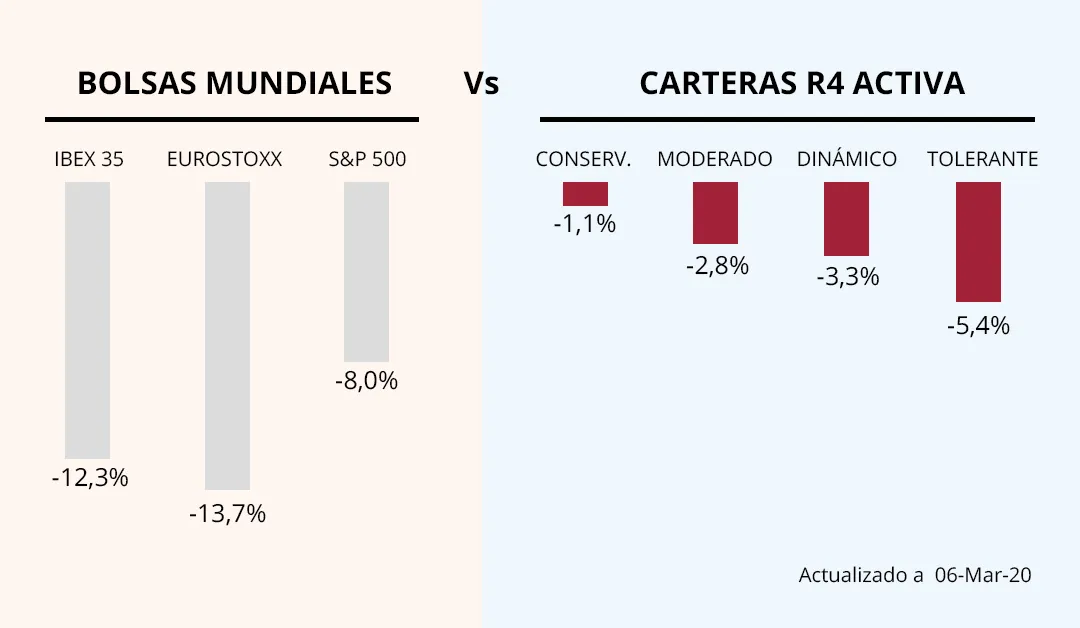 Es interesante comprobar que como efectivamente, aquellos inversores que hubieran optado por invertir en las carteras gestionadas por el equipo de gestion activa de Renta 4 estarían observando la situación desde una posición significativamente más cómoda. Así, las carteras de gestión activa de Renta 4 Banco están soportando mejor el impacto en los mercados mundiales. Tal y como se puede ver en el gráfico, a pesar de las caídas, nuestras carteras están sobrellevando mejor los vaivenes, minimizando el riesgo y limitando las pérdidas.