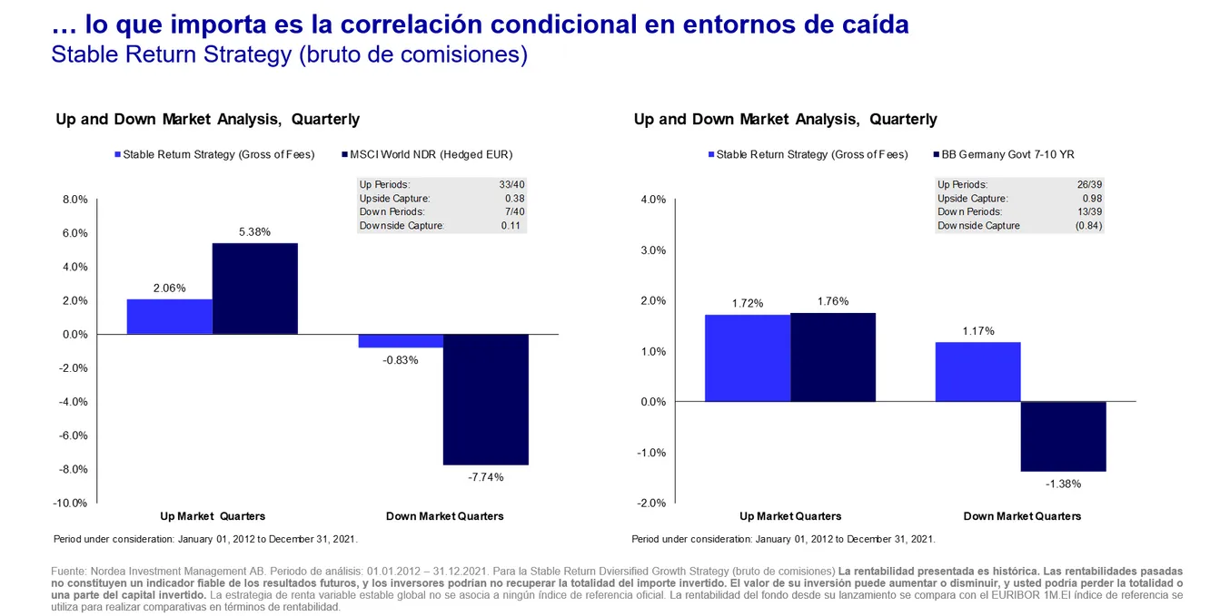 A lo largo del año pasado, el Nordea 1 - Stable Return Fund en su clase banca privada logró una ganancia cercana al 11%. “2021 fue uno de los mejores años para el Stable Return desde el lanzamiento del fondo. Batimos la media de la categoría en Morningstar, que tiene unos 800 fondos. Lo hicimos mejor que la categoría con una beta considerablemente inferior. El comportamiento de nuestro fondo solo es explicado por su sensibilidad a la renta variable en un 18%, frente al 35% o al 40% de la categoría. Fuimos capaces de capturar más mercado alcista que nuestros competidores”, ha destacado Balteo.