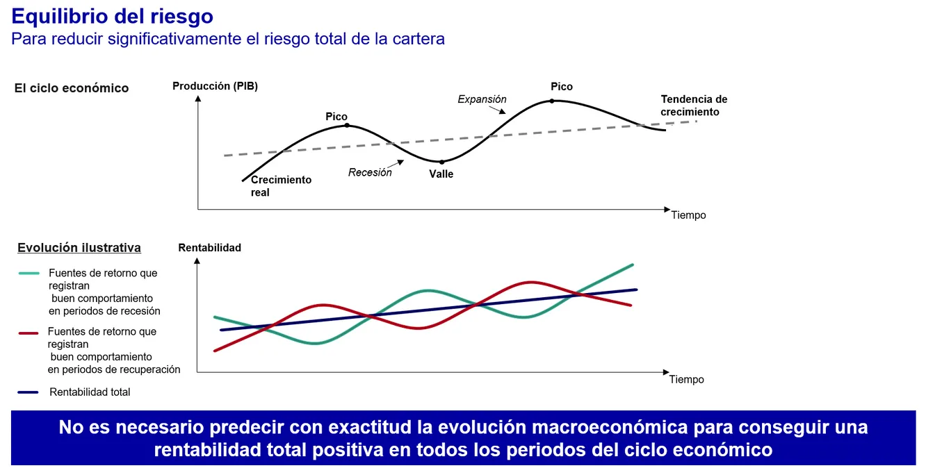 ¿En qué consiste esta filosofía de inversión? Busca minimizar el riesgo invirtiendo en una cartera diversificada de activos no correlacionados. “Tenemos dos tipos de estrategias en cartera. Hay posiciones en activos que tienen una alta correlación con el ciclo económico y otros activos que tienen un perfil más defensivo, que suelen ser muy buenos protegiéndonos en entornos cuando la Bolsa cae, pero que a lo largo de un ciclo de inversión, período durante el cual tradicionalmente la bolsa sube, no nos deberían costar dinero. Luego tratamos de equilibrar la cartera teniendo una exposición similar a los activos agresivos y a los activos defensivos en términos de exposición al riesgo”, ha explicado Balteo.