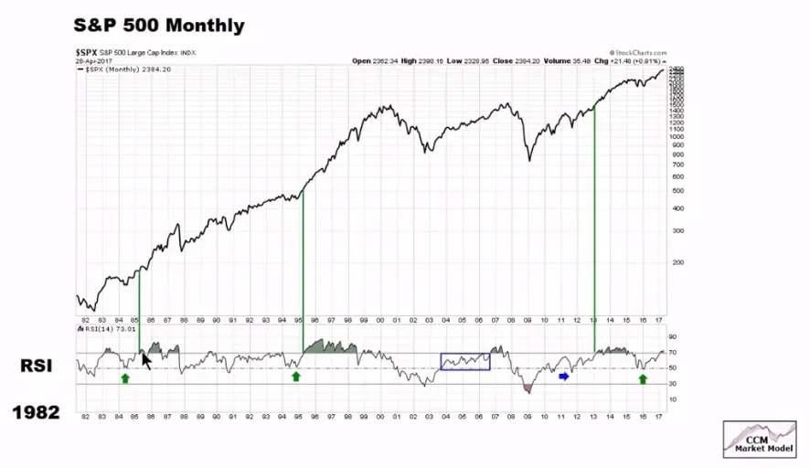 La imagen la tenía guardada en el pc desde hace algunos meses y por tanto no está actualizada a fecha de hoy(abarca solamente hasta Abril2017). El estudio gráfico es del analista USA CCM Market Model, y muestra como el hecho de que el indicador RSI14 entre en sobrecompra(>70) no es motivo de freno en la subida sino más bien todo lo contrario. Parece que en tendencias primarias alcistas de larga duración lo normal es que estos indicadores se mantengan precisamente sobrecomprados durante largos períodos sin que esto sea motivo de preocupación.