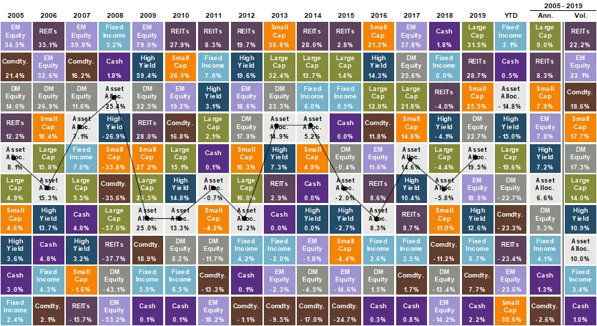 El siguiente cuadro refleja el comportamiento de una cartera modelo correctamente diversificada durante cada uno de los 15 últimos años, el comportamiento de cada activo es muy dispar año tras año, pero demuestra las bondades de la diversificación, con un retorno final, al cabo de los 15 años del 6,6% y una volatilidad media del 10% (dos últimas columnas, Ann: media anual de retorno del activo durante 2005-2019 y Vol.: volatilidad) En la columna YTD (desde comienzos del año del 2020) se puede observar el resultado negativo de cada activo. A destacar el 2008 con una bajada del 25,4% y el 2009 con una subida del 25%.