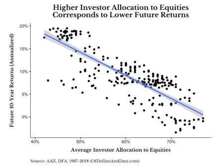 Why The Best Predictor of Future Stock Market Returns is Useless (Of Dollars And Data, @dollarsanddata). Como casi siempre en Inversiones, la diferencia entre la teoría y la práctica reside en el comportamiento. En este caso el porcentaje de dinero en bolsa de los inversores es un indicador de futuras rentabilidades ... en teoría. Pero como dice el autor ¿a qué coste psicológico?