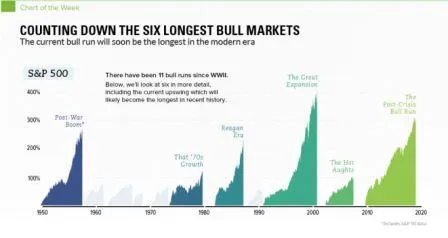 - Visualizing the Longest Bull Markets of the Modern Era (Visual Capitalist, @jeff_desjardins). Infografía que muestra con detalle y datos los 11 mercados alcistas que ha habido desde la segunda guerra mundial. Como siempre ¡muy gráfico!