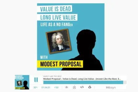 - Podcast - Value is Dead, Long Live Value, with Modest Proposal (Invest like the Best, @patrick_oshag). Entrevista a un gestor anónimo sobre Gestión activa, Value Investing, Career Risk, qué ha cambiado (si que ha cambiado algo), oportunidades en precio, los problemas de la gestión activa, etc.