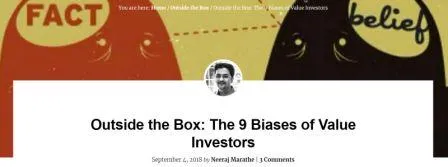 - The 9 Biases of Value Investors (Safal Niveshak). Buen resumen de algunos de los principales sesgos que afectan a los inversores value. Son sesgos que quizás no aparezcan en los típicos listados porque parecen específicos de esta filosofía, pero de una manera u otra se encuentran englobados en los sesgos generales.