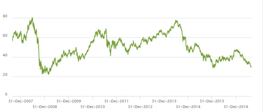 La causa de la mala rentabilidad no es otra que la caída del precio del crudo. Las compañías de este fondo pasivo están ligadas al precio del petróleo, por eso, existe una correlación entre el ETF y el precio del crudo.