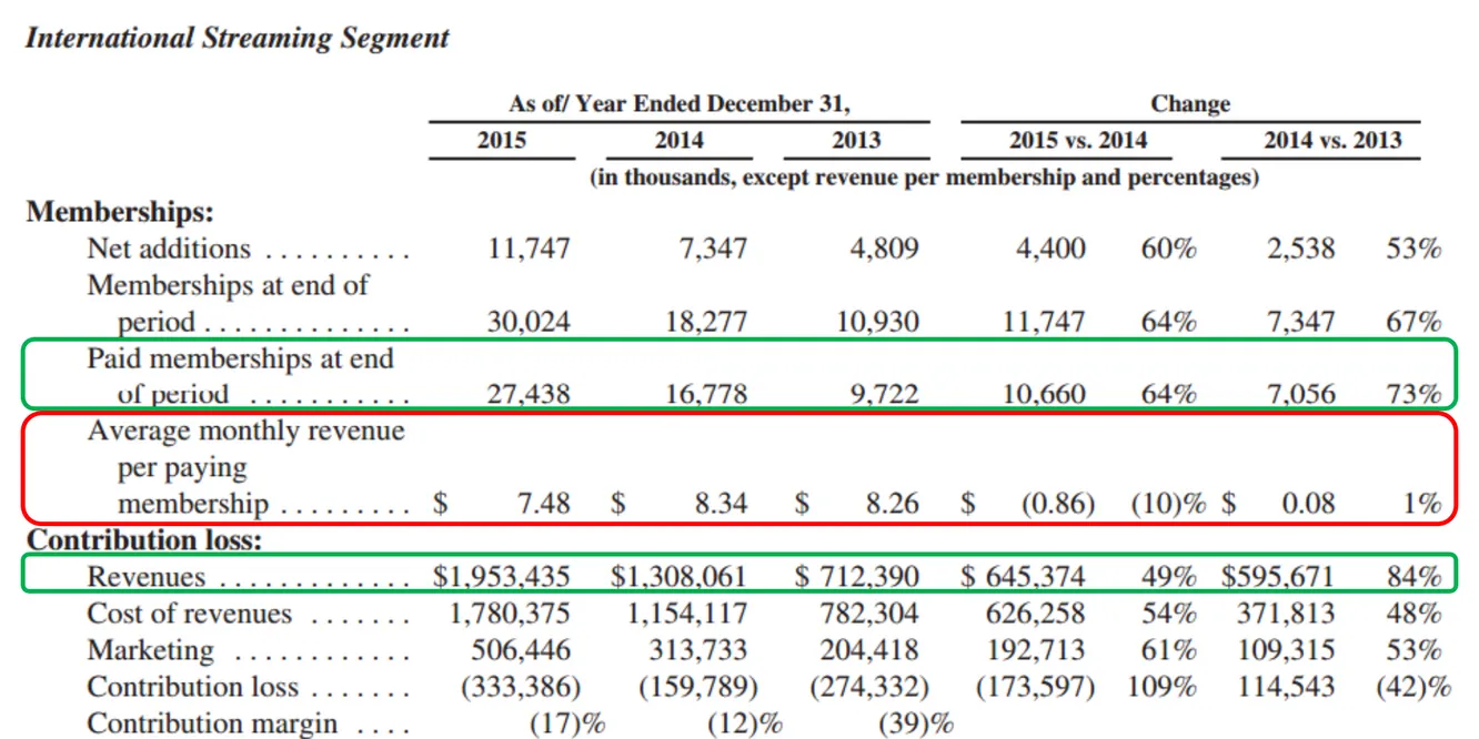 La parte más positiva de Netflix es su gran crecimiento. En Estados Unidos, el 15 % de la población tiene contratado el servicio a un precio medio de 8,5 $ al mes. Además, tiene 27,4 millones de suscriptores internacionales que pagan de media 7,48 $ al mes. Con estos datos, confirmamos que la empresa está Efectivamente, si continúa con estas tasas de crecimiento logrará aumentar sus ventas. De momento, el aumento de las ventas no se traslada a los resultados, ya que la expansión le está costando muchos recursos. Además, hay que tener en cuenta que existe una competencia que también está creciendo y expandiéndose internacionalmente. Se puede hablar de la existencia de una burbuja en el mercado de series, hasta el punto de que Amazon está produciendo las suyas; a este paso, Mercadona e Inditex rodarán sus propias series…